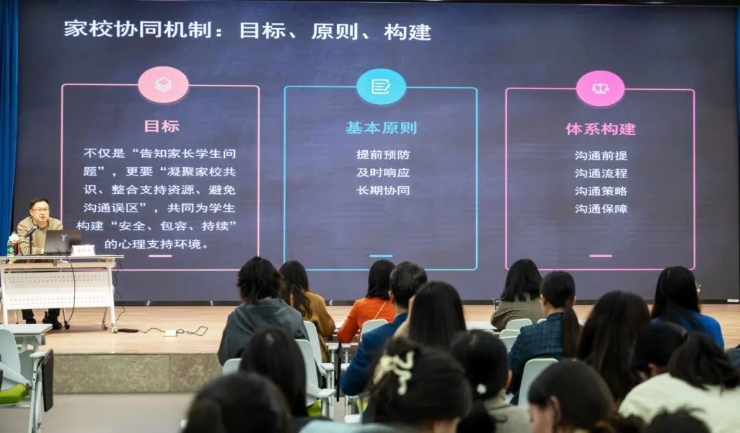 在家校共育专题培训中,南京师范大学心理健康教育咨询中心曹加平副教授以“家校协同,守护学生的心理健康”为题,系统阐述了家校协同育人的机制构建与实践路径。他强调,家校应充分凝聚共识,以学生为中心,从单向通知转变为双向协同,在学生心理危机应对的前、中、后各阶段精准协作。本次培训有效促进了区域内各高校心理健康家校协同育人水平的整体提升。