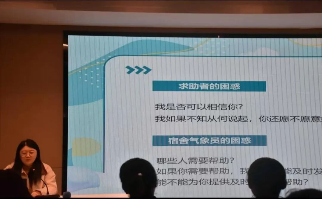袁玉老师则以角色定位为切入点,深入剖析了宿舍气象员的核心职责,强调宿舍气象员需积极配合班级心理委员、学院辅导员及心理中心开展工作,助力心理危机排查。袁老师重点阐释了“保密”“价值中立”“宁可误报,不可不报”“包容接纳”四大工作原则,并结合典型案例,详细讲解了观察、倾听、询问三大助人技巧,为学员提供了切实可行的实操指南。