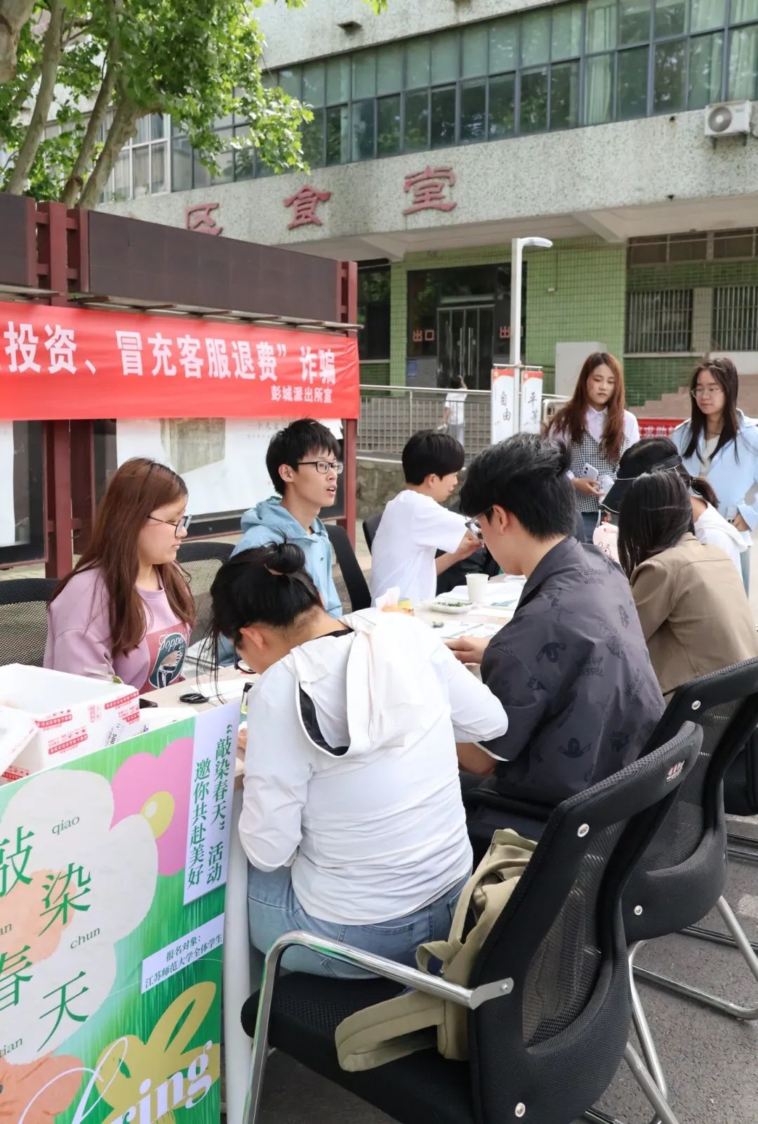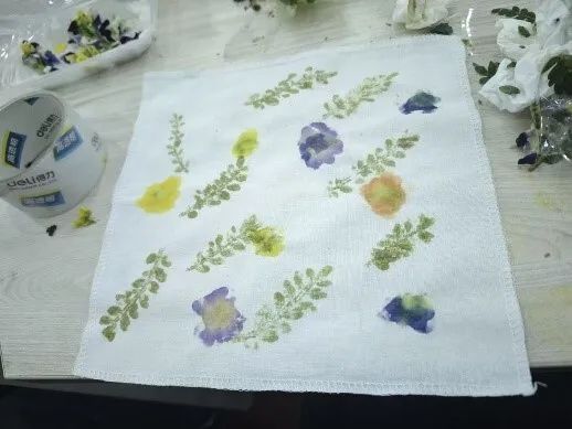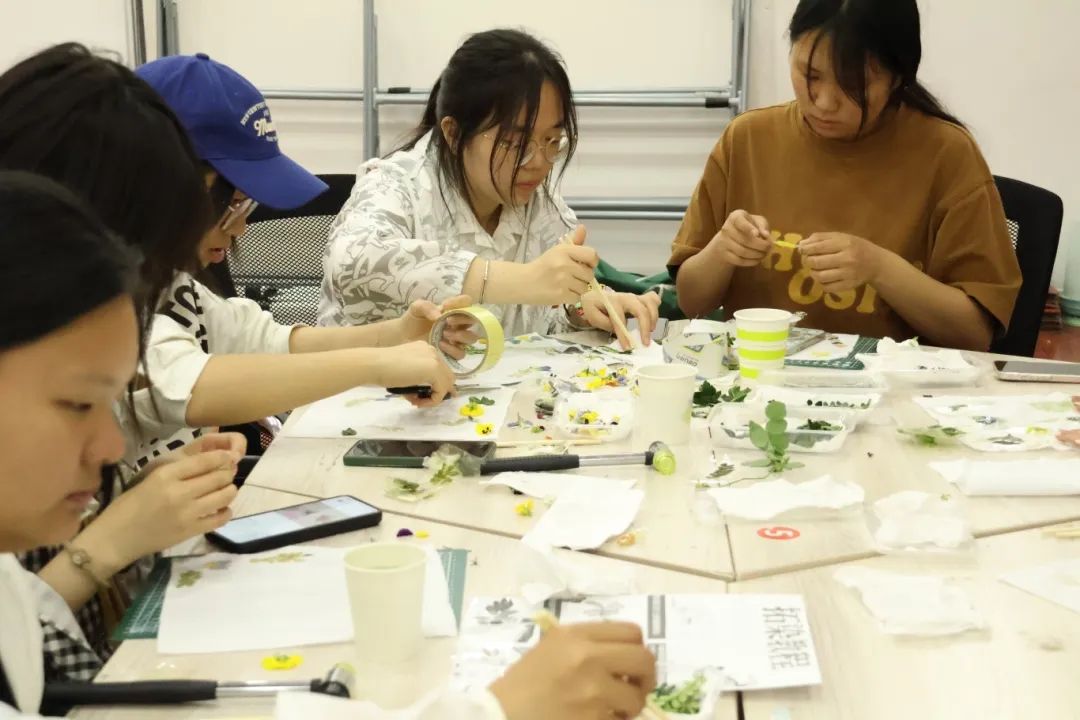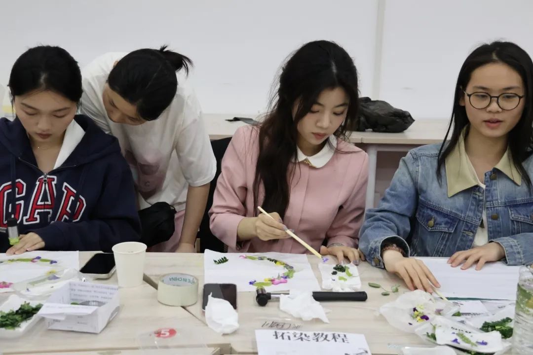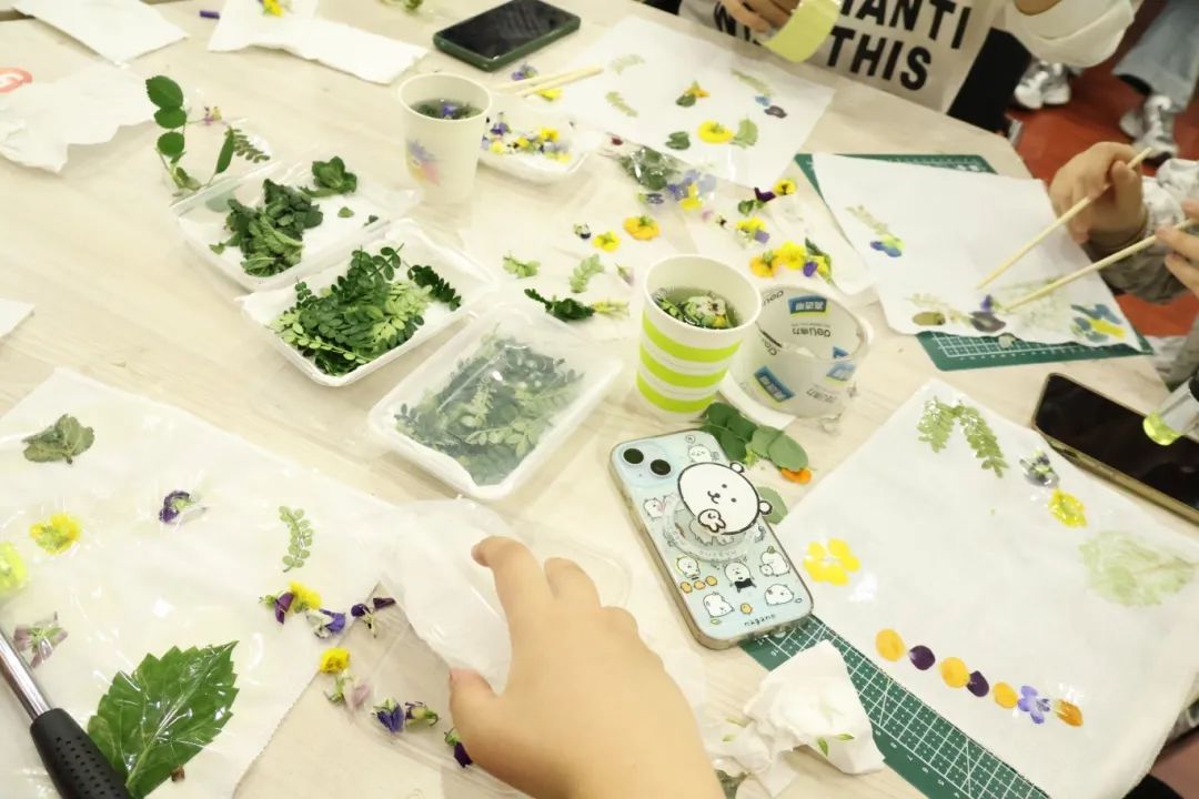 活动现场欢声笑语不断,志愿者穿梭其间,协助参与者固定植物、调整构图,并指导大家如何通过不同敲击手法展现植物的层次美感。完成作品的同学们纷纷在工作人员处拍照留念,将承载春光的方巾珍藏。一方布帛,既是定格自然灵动的艺术品,亦成为心灵疗愈的载体。