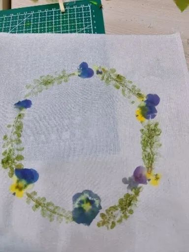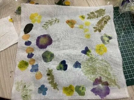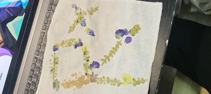 参与者签到后即可领取鲜花、叶片、素拓方巾与敲打锤等物料,在志愿者指导下,学习如何固定植物位置、掌控敲击力度。随着此起彼伏的敲击声,三色堇的紫白渐变、蕨类的绿逐渐晕染布面,形成独一无二的纹理。同学们将对春日的向往、对美好的期许,乃至沉淀的情绪,悉数融入作品,让自然的脉搏在布纹间跳动,谱写属于自己的春日诗篇。