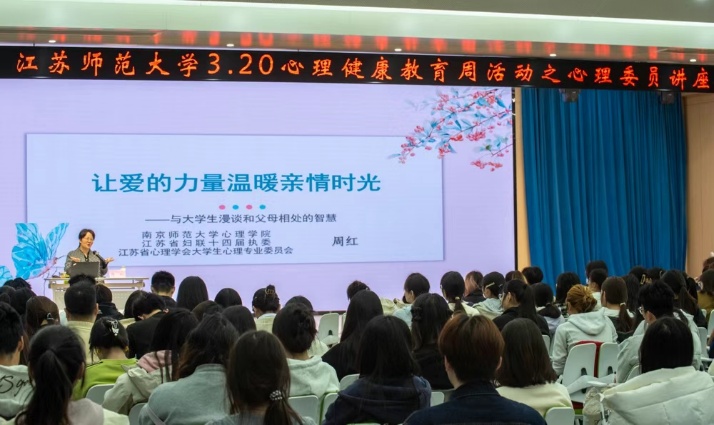 2025年3月21日,江苏师范大学心理健康教育中心举办了以“让爱的力量温暖亲情时光——与大学生漫谈和父母相处的智慧”为主题的心理委员讲座,旨在帮助大学生更好地与父母沟通,提升家庭相处质量,促进心理健康成长。本次讲座邀请了南京师范大学心理学院周红书记担任主讲嘉宾,吸引了来自全校各学院近200余名学生到场聆听。
