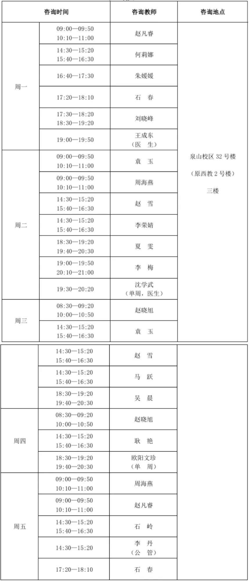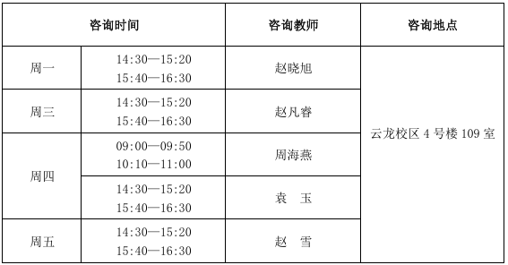 备注:第二周起,同学们可选择电话或现场预约的方式进行咨询预约。